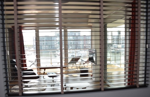 Enjoy the unique view from the electrically adjustable box spring bed in the bedroom directly onto the marina. The panoramic window between the bedroom and living room has a high-quality wooden blind. By adjusting the slats you can determine yourself what you want to see or how much light should flow into the bedroom. Even in the dark, a wonderful feeling of space with a wonderful view.