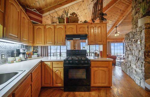 A large stone fireplace (seasonal) is the centerpiece of the dining, kitchen, and living area, and provides a cozy backdrop for enjoying a cup of coffee, conversing with friends, reading a good book, or napping.
