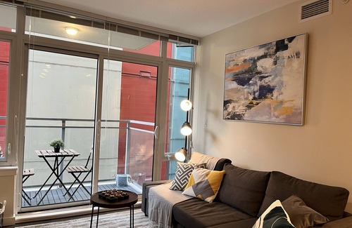 Enjoy a stylish experience in the heart of Olympic Village! Bright, well laid out 1 bedroom and den offers great floor plan. Hardwood floor, gourmet kitchen with quartz stone counters, gas stove, stainless steel appliances;spacious bedroom with extra large closet;dedicated den for work and storage space; balcony and AC!