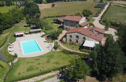 Fantastic typical Tuscan structure, detached stone house in the middle of a unique idyllic landscape for up to 22 people, enchanting garden, private heated swimming pool, super-equipped barbecue area, wine tasting, WiFi internet, air conditioning (in 4 bedrooms ), suitable for children, SPA area (on request) with sauna and hammam, private fishing pond, suitable for large family celebrations, absolute privacy. Large party room and professional kitchen.