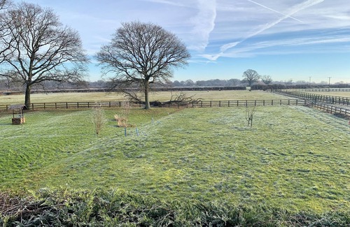 Loft studio in a rural position close to Southampton, Winchester, Hedge End and the Utilita Bowl. Quiet location down private drive with parking & stunning views overlooking fields. New accommodation with en-suite shower facility & kitchen area with Panasonic combination microwave oven & a fridge. Ample storage with additional cupboard space in eaves. Dining table with two chairs that doubles up as work area. Conveniently located USB sockets. Outdoor table & chairs for al-fresco dining.