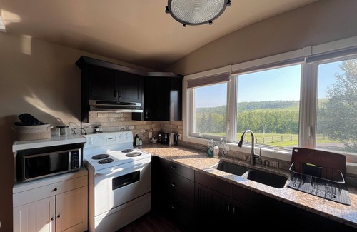 This private 2 BR suite is surrounded by mature trees, rolling hills, and stunning views. It features 2 bedrooms (each with a queen bed ) , a bright and inviting kitchen, a full bathroom, and an open-concept living room. Note that the suite has its own private entrance and is located above the garage. We are a family of 4 with 2 friendly puppies (huskies), and are exited to share with you a special stay at our farm house "Solis Permaculture". We are currently growing a fruit orchard and vegetable garden . We are passionate about bee, this is why you will find a few beehives in our yard! This acreage is a peaceful escape surrounded by nature and yet close to the city .