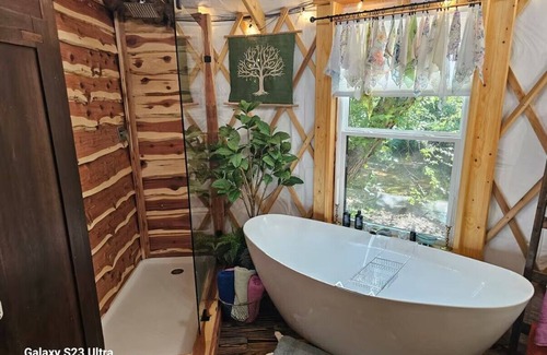 This new 30' Yurt is situated perfectly, right on Potts Creek. The mountains have always been a magnet for the free spirit of a gypsy soul. If thats you, come escape into the solitude of the Feathered Fern Yurt! A fun - colorful Boho theme, you'll be surrounded by soft textures and luxuries not found in such a setting as this. Find yourself in the warmth of a large Slipper Tub peering out the window over the babbling stream. Peace & solitude you will find here.