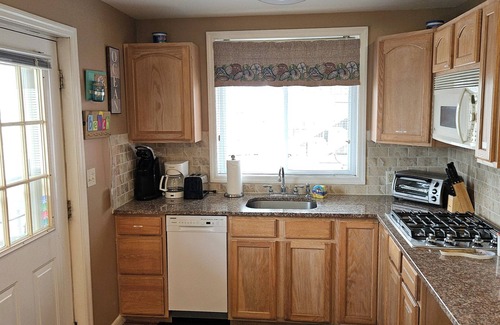 The modern kitchen is fully equipped with a four burner gas stove top-refrigerator-dishwasher-microwave/oven-coffee maker(Keurig and regular)-crockpot-dishes-utensils-pots and pans. Granite counter tops and tile floors.