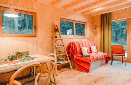 MOMO stands on the forest floor, it is the only one of our six solid wood chalets. From the living area we can see the deer walking outside.