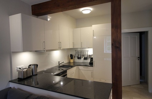 The kitchen is modern and fully equipped with a granite kitchen counter, hob, oven, dishwasher, fridge (with freezer) and all the necessary tools. The bathroom offers a sink, toilette and a shower.