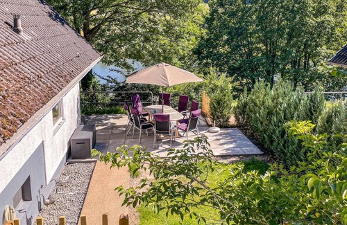 In front of and next to the house is a partially covered terrace with garden furniture and barbecue. There is also a small lawn area. Part of the grounds is enclosed by a fence (approx. 80cm). In a cellar room there is a washing machine + tumble dryer as well as outdoor games and cushions. Bicycles can also be safely stored here.