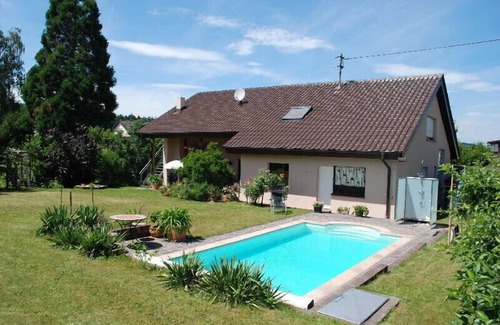 Die Ferienwohnung befindet sich im Dachgeschoss, des von einem Ehepaar bewohnten Einfamilienwohnhauses. Der solar beheizte Pool (7x4 m) ist über eine Treppe vom Balkon erreichbar. Die Wohnung wurde neu ausgebaut und ist in hervorragendem Zustand. Unser Haus befindet sich in Ortsrandlage, nach Süden mit freier Sicht. Die Wohnung mit 60 qm Wohnfläche (ohne Balkon) hat folgende Räume: - Schlafzimmer mit Doppelbett 180 x 200 cm und Kleiderschrank - Badezimmer mit Dusche, Badewanne, 2 Waschbecken, WC - separates WC - Küche mit Herd, Backofen, Kühlschrank, Spüle, Geschirrspülmaschine - Wohn- Esszimmer mit Esstisch, Wohnzimertisch, Couch, TV - großer Balkon mit Gartenmöbeln