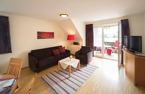 So wohnen Sie bei uns Es erwartet Sie eine Ferienwohnung für zwei bis vier Personen und einer Wohnfläche von ca. 50 qm. Die liebevoll ausgesuchten Möbel und schreinergefertigten Schlafzimmer geben den Räumen Atmosphäre und Stil. Telefon, kostenloses W-LAN und Flatscreen/SAT-TV bieten Ihnen den gewohnten Komfort. Die Küche ist mit Spülmaschine, Mikrowelle und Cerankochfeld ausgestattet, im Wohnraum kommt eine Mini-Kompaktanalage dazu. Genießen Sie schönes Wetter auf den Südbalkons und Terrassen. Die Ferienwohnung ist mit 4 Sternen **** vom DTV (Deutscher Tourismus Verband e.V.) ausgezeichnet. Suchen Sie sich Ihren Lieblingsplatz Aufenthaltsraum, überdachter Freisitz, Liegewiese und Grillgelegenheit laden zum Verweilen und Entspannen ein. Für Ihr Fahrzeug haben wir überdachte Abstellplätze. Unser Service: Bettwäsche, Hand- und Geschirrtücher, Brötchen-Service, Bademantelverleih. Waschmaschine, Trockner und Bügelgelegenheit im Haus.