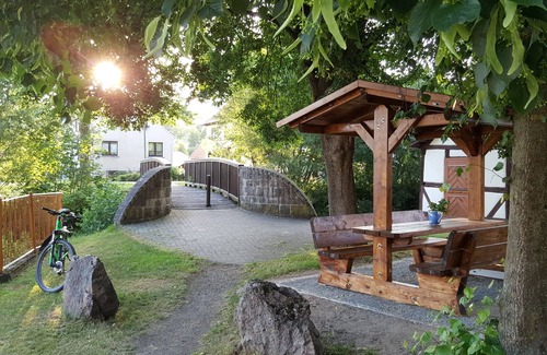 Dear guests, I offer you a very spacious holiday apartment (approx. 48m²) with a terrace (+ approx. 12m²). The location is on the outskirts of Steinbach-Hallenberg. Despite this, they are only a 15-minute walk to the train station, bus stop, center and bakery. There are very good shopping opportunities nearby. The connections to cycling and hiking trails are right in front of the front door (street to the right and left, stairs up and down next to the house). The equipment includes a large living / bedroom, separate kitchen, shower / toilet, TV / radio, WiFi on request, terrace, courtyard entrance for cars / bicycles, storage space for bicycles / skis in the garage.