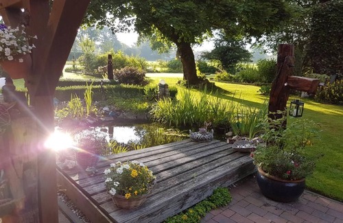 MOIN in Rhodoland Ammerland The Landhaus Westerlo is located in the rhodo- and cyclist paradise Ammerland, close to the Zwischenahner Meer and the North Sea coast. We offer two barrier-free apartments, with electrically adjustable box spring beds and two apartments upstairs. The apartments are equipped with rain forest showers and fitted kitchens, as well as with large Smart TV. We have finished the construction of these apartments just at the end of 2017, they are located in a new building on a former farmstead, in beautiful rural surroundings. The building is a verklinkerter timber frame construction and is heated by a floor heating, so we have here a very pleasant living environment. The windows are triple glazed and we have placed special emphasis on sound insulation, so you can come to rest here well. The parking lot is in front of the house and there is a laundry room. For recreational activities, our area offers a variety of opportunities, but if you want to spend their day here, there is the possibility of using the barbecue hut and the beautiful garden, overlooking the meadows. Directly in the building complex is a naturopathic practice, where they have the opportunity to do something for their health. www. naturheilpraxisschnitger. de