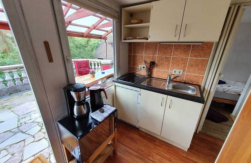 The non-smoking cottage in bungalow style is on a 60 sqm large, stone-paved and fully tiled terrace, in about 480 m altitude in south-facing slope overlooking the Bodetal. It was completely renovated in 2012. The small bathroom is decorated in warm colors and has a shower, toilet and hand basin. The kitchen is designed as a galley, it goes into the living room. The heating is done by a stove, there are also electric heaters available. A garden gate behind the bungalow leads to a hiking trail to Hüttenrode, to Krockstein and the Rapp-Bode dam through the species-rich and game-rich nature of the Upper Harz.