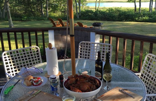 Deep Bottom Pond rental with lots of space and pond view. House sits in a lovely setting on a cul de sac. Beautiful open kitchen with breakfast nook. Large living room with bright dining area off to the side. Sit on the back deck and take in the views across the pond to the horse paddocks, watch the evening light play across the field or see the morning mist give way to a bright blue Vineyard sky.