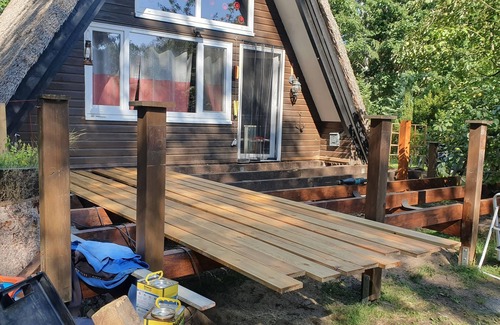Welcome to Kristians Hus in Gartow am See. You will spend magical days here in a thatched, newly renovated Nurdachhaus. Whoever wants to relax completely is right with us. Kristians Hus is located on an approximately 800 square meter natural site. The kitchen and bathroom have been completely renovated and new. In the upper part of Kristians Hus there is a bedroom with a double bed and 2 extra beds. In the spacious living area there is a double sofa bed. The Finnhütte has a pretty terrace and of course the opportunity to sit in the garden of the hut. Our Wendlandtherme is not far from Kristians Hus, next to it is the tennis court with mini golf course and water playground for our kids. If you come with your four-legged friend, he will really enjoy Gartow, because in all directions from Kristians Hus, long or short walks are possible. The Gartower See has several swimming areas and a large dog meadow with lake access. I can assure you that you will have a great time with us. See you soon, your Anja Kamp