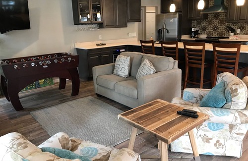 Fully equipped kitchen includes brand new high end appliances (Fridge, range, microwave, dishwasher, garbage disposal, separate beverage fridge, toaster, coffee maker (Kuerig and drip). Cooks will be right at home in our kitchen - plenty of baking dishes, flatware, serving ware, wine glasses, coffee mugs, and utensils. We have a few basic condiments and spices available.