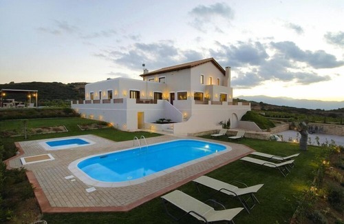 Fantastically beautiful XXL holiday villa with premium equipment, large swimming pool with separate children's pool on a 2,000 square meter garden plot. The villa has a modern Bio Climatic Air System, which keeps the temperature inside the building at a normal level. The villa is located on a hill and offers you a fantastic panoramic view of the vineyards and the surrounding mountain landscape all the way to the sea from the spacious sun terrace. The peaceful and quiet surroundings as well as the privacy offered make Villa Selena an ideal location for summer and winter and an excellent choice for family reunions or groups of friends who want to escape from everyday stress and enjoy a wonderful trip. Your holiday home is in Choudetsi, a small village with taverns and shops, located around 19 kilometers south of the capital Heraklion. It is only a few kilometers to the Vathypetro archaeological site, where you can see one of the oldest wine presses in the world. The complex dates from the late Minoan period and was part of a settlement that stretched over three hills. Extras included: Intermediate cleaning included twice per week For over 14 nights bookings a traditional dinner is offered Activities nearby: Of course, a visit to Crete's capital Heraklion should not be missed - one of the most famous sights is the Archaeological Museum, which exhibits numerous finds from the Minoan era. The beautifully landscaped harbor of Heraklion with the Venetian castle is also worth seeing. And a stroll through the historic old town is also extremely attractive. Here you can look at Lions Square, which is the center of the old town, browse through the many shops and take a little break in one of the taverns and cafés Mobility: Not suitable for people with limited mobility