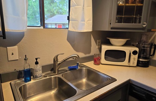 Experience Rainier like a local in this quaint 1-bedroom cabin, where you can take it easy at this unique and tranquil getaway. Located in the foothills of Mt. Rainier you can practice your fly fishing for cutthroat trout or kayak and tube float down the river from the bank just outside your door. Relax on the covered deck and listen to the Little Deschutes river as it flows gently past this fantastic property that offers a cozy retreat for guests. With its enchanting living room, complete with a sofa bed and a twin bed, as well as the master bedroom with queen bed and luxurious linens and comforter, and a bathroom with a hot shower and fluffy towels, you'll have plenty of space to relax and unwind. Stay connected with wifi, and enjoy the convenience of a hair dryer, washer and dryer, dishwasher, microwave and convection oven. For colder nights there's a propane wood stove in the Livingroom and heating to keep you comfortable. Whether you're exploring the breathtaking scenery or indulging in local cuisine, this cabin is the perfect home base for your Rainier adventure. We'll be glad to help you with information about things to do and see! Just 10 minutes east of Rainier, Washington where you'll pass sheep and cattle grazing in fields dotted with live oak and glacial rocks, it's easy access to fun little restaurants or drive in to see Washington State's capitol, just 30 minutes to Olympia where you'll find great eats and things to do. After a day you'll never forget let the forest sounds, and perhaps the river otters chatter, put you to sleep...at the Otter House