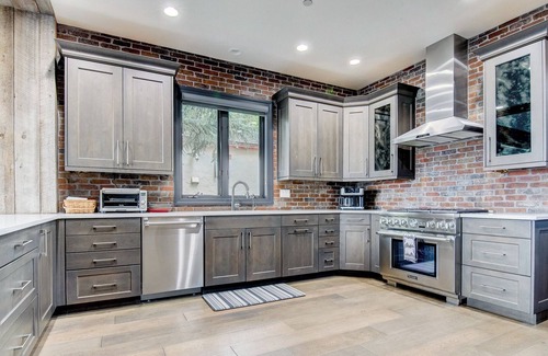 Upon entry, you'll be met with a bright interior and a cozy atmosphere throughout the well-appointed living space. The breathtaking view from the living room is unlike any other, with oversized windows showcasing the mountains and valley. Relax and make yourself at home by resting on the plush furniture, admiring eclectic art, curling up with a good book by the fireplace, or watching a movie marathon in the premium recliners on the large TV. The kitchen tastefully marries industrial and rustic design with its sophisticated layout, boasting state-of-the-art stainless-steel appliances, ample cupboard room, and a formal dining table.