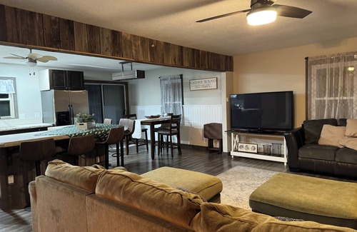 Your home away from home in Council Grove with 4 bedrooms - 3 queen beds and a room with 4 twin bunk beds. This country house features full amenities with WiFi, fitness equipment, washer and dryer, AC/Heat, Full kitchen, sitting room, and spacious living room! Guests can unwind on the porch with a fire pit watching the sunrise or sunset overlooking a pond and windmill. The Flint Hills has so much to offer with the beautiful Kahola Lake, Council Grove Lake, Tallgrass Prairie Nation Preserve and many other attractions in Council Grove all within a short distance. Kickback, relax, and enjoy everything the Flint Hills has to offer at the Flint Hills Hideout.