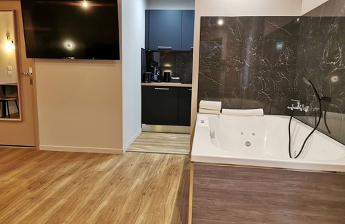 Highlights: Ground floor, double whirlpool (2 people), air conditioning, large king size bed 180cm by 200cm