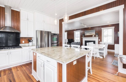Kitchen: Fully equipped kitchen with modern amenities and a large island overlooking the beach, ideal for preparing meals and hosting happy hour gatherings.