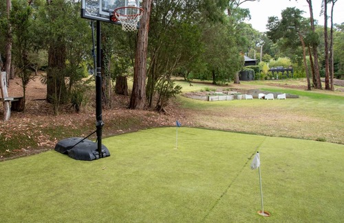 Additional amenities include a carport, refrigerated heating and cooling, and ample water storage. There is a golf green in the backyard and an Astroturf chipping zone onto a green. Clubs and balls are available.