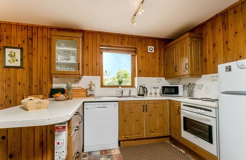 One storey Lodge with covered veranda with outdoor furniture and lovely views. Two bedrooms one double with en suite shower room and one twin bedroom, main bathroom with bath and shower over. There is a pull down child's bunk bed available at the head of the twin bedroom. Living room with dining, sitting and kitchen area. Fully fitted with free Wifi, flat screen TV and Dvd. Set in 3 acre gardens with putting green, games room, children's swings and sandpit. Set on a quiet country lane but only twenty minutes walk from Minehead with it's shops and restaurants and beach beyond. Parking next to Lodge