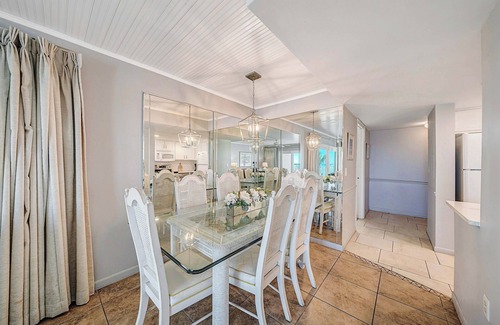 This ground floor, beachfront, corner condominium unit offers approximately 900 feet of coastal living space, featuring ceramic tile throughout. This unit includes a fully equipped kitchen featuring quartz countertops, spacious living area with pullout sofa, dining area, one bedroom with 2 Queen sized beds, and two full bathrooms. For your convenience, there is also a private exterior laundry room. Dine or lounge on your large private covered corner patio overlooking the gulf and the gulf front swimming pool. This unit offers the perfect getaway for a relaxing beach vacation!