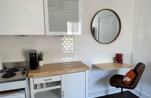 Cozy studio with 1 queen bed and a full pull out sofa sleeper. Includes kitchenette with stove top, sink, refrigerator, ice box, microwave, cupboards and utensils. Plenty of storage for your things in the 1960's vintage dresser or closet. The space includes a murphy fold up desk for WFH or browsing with the included wifi and 50" smart TV. This is a standalone building with no shared walls, yard or entrance and comes with a private parking space.