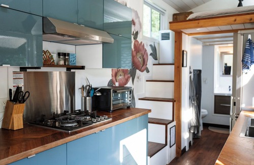 Our cozy Tiny Home was built in 2018, has beautiful views of Frolander Bay, and is nestled on a hill at the top of our 2.5 acre property.