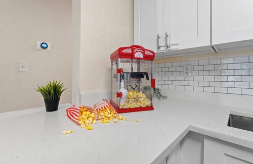 KITCHEN & DINING: A fully equipped, upgraded kitchen with granite countertops, a full-sized refrigerator, stove, oven, microwave, class. popcorn maker and a fully-stocked coffee station. Includes a dining table for meals or games.