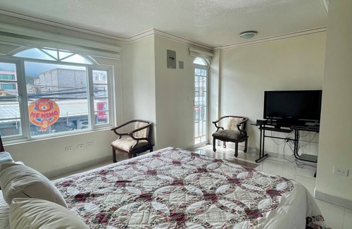 Apartment in Quito, located near the Middle of the World. Functional space with equipped kitchen, furnished bedroom with a very comfortable double bed, balcony, sofa bed, private bathroom, and free Wi-Fi. The area offers restaurants, shops, and easy access to public transportation. Immerse yourself in the cultural and geographical richness of the Middle of the World by visiting the Equatorial Monument and the Intiñan Site Museum, and enjoy local cuisine at nearby restaurants.