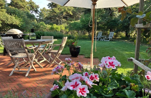 A short walk or bike to the beach (10 - 15 minutes at a leisurely pace... you want to be leisurely on your vacation!), we offer privacy and seclusion, facing South toward the breezes and the sound of the surf. Although true to Colonial architectural detail on the outside, the downstairs has an open plan, centering on a wall of glass that opens out onto a porch and steps down onto a brick terrace. The two bedrooms upstairs each have a skylight through which to watch the stars. The outdoor shower rocks!