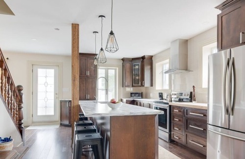 Amenities: Wifi, washer & dryer, dishwasher. There are three bedrooms on the second floor. Two bedrooms have double-beds (new mattresses) and one bedroom a single bed (sleeping space for 5). Full bathroom on second floor with heated floor, and half bath on main floor. The main floor has an open-air concept and boasts of a kitchen with tons of cupboard space, a 10-foot island, a separate dining room and a living room with cable TV. The house has private parking (plowing included) - the driveway holds up to 3 cars. Also included, blankets, bed sheets, pillowcases, towels, toys / books for children and adults, and much more.