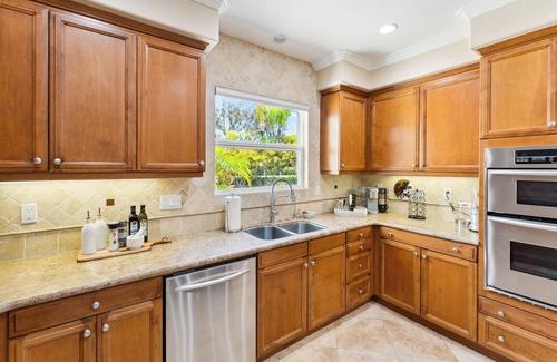 The primary bedroom is a peaceful retreat, contained in its own suite. As you enter, you feel the ocean breeze with the open patio doors and you can enjoy the beautiful views of a lush tropical oasis. The bedroom is furnished with a plush king-sized bed, new comfy mattress, new Samsung 4K Smart TV and is adorned with tasteful decor. There is also a secondary desk area to allow for some quiet time. The bedroom leads to 2 full size walk-in closets allowing for ample storage. As you walk through the suite, the ensuite bathroom features two sinks, a spacious bathtub with spa-like features and a walk-in shower for your comfort.