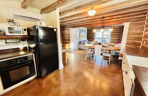 This 18x32 hand-hewn log cabin was dismantled and moved from a neighboring farmstead to the Green Gate property in 2016. We added an upper floor, super-insulated shell and a rustic exterior of weathered, circle-sawn planking and rusty metal roofing. The mix of log construction, custom metalwork, and "hand-crafted everything" create a truly breathtaking architectural experience.