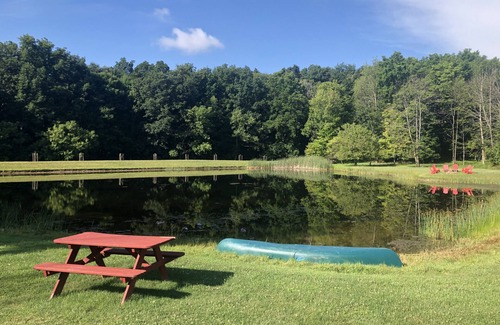 Newly renovated private cabin centrally located between Canandaigua and Honeoye. Our cabin is nestled on 25 private acres including a pond, and is minutes from tons of outdoor recreation, great breweries and restaurants. Hike, Bike, Cross Country Ski, or Snowshoe right from our cabin. Incredible views throughout property, wildlife, fish our stocked (bass and trout) pond, hike our private 1-mile trail. The best nature, recreation, and dining in the finger lakes.