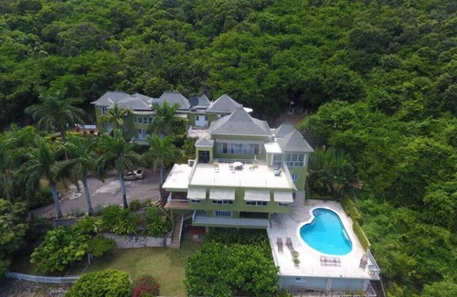 The villa is Mediterranean style structure with wide indoor/outdoor vistas, overlooking the blue Caribbean sea and the picturesque outline of the city of Montego Bay. It is nested in massive palm trees and tropical foliage overlooking the lighted tennis court and swimming pool. Located 20 minutes from the airport and 15minutes from the city centre. Great for families, groups, weddings, birthday parties, and corporate retreats. Spectacular ocean views, experienced friendly staff. Adequate areas for private relaxation and recreation. We have a lighted tennis court, pool table and stair climber exercise machine.