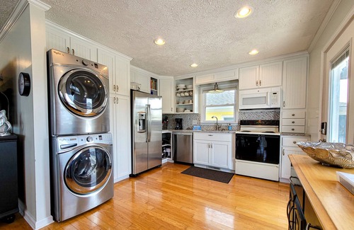 "Hoot" offers 2 bedrooms and 2 full bathrooms. You enter this floor through the top deck porch door using your Keyless Access code that will be provided before check-in. You are greeted by the large Kitchen that offers all major appliances and the basics for all of your cooking needs! The full-size stacked washer and dryer are located in the Kitchen for easy guest access. The dining area offers a large table where the whole gang can gather for family meals or epic game nights. The open living room offers a comfortable sectional sofa and a Large Flat Screen SmartTV. Connect to your favorite streaming apps or enjoy 50+ channels using the over-the-air antenna connected to this TV.