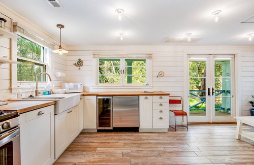 Hands down the most stylish cottage in Folly Beach, "This Place Cottage" will have you slipping into coastal bliss from the moment you arrive. The home sports a vibrant exterior with tropical foliage surrounding an adorable front porch. This getaway sits in the center of all the best attractions and is a short walk from the beach so that you can use each dreamy vacation day to the fullest.