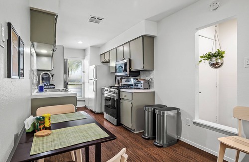 Step into two bedrooms that embrace the vibrant, retro-inspired spirit of Austin, accompanied by a stylish and convenient bathroom. A spacious living room forms the heart of this space, complete with a brand-new 65-inch HD TV—a perfect setup for movie nights or unwinding with your favorite shows.