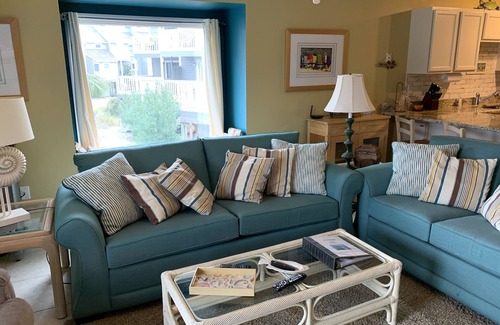 The den features both Love seat and Queen sleeper sofa with very comfortable Memory foam mattress. There is an electric fireplace which provides ambiance and warmth in Winter, with 46” flat screen TV above. FUNSEEKER is an end unit and features a large picture window with window seat which provides lots of natural light. There is a large deck off the den with gulf, clubhouse and lake views. There is patio furniture and a gas grill on this deck. Also a gate which is nice for the little ones and pets.