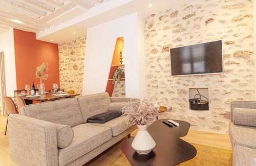 Close to the very central and dynamic rue Montorgueil, this apartment is an ideal base to discover the lively center of Paris. It's in a renovated 18th century building, and the house's slightly retro interior design and exposed stone walls give it a dose of character. Our apartment places you in the heart of the city, in an authentic Parisian neighborhood that offers easy access to the sights.