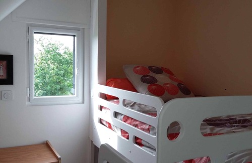 - bedroom 2: 1 bed 90x190 and 1 mezzanine bed100 x 190 with 3 steps, 1 chest of drawers, 1 desk, closet (blankets, duvets, pillows, various games for children, comics ...)