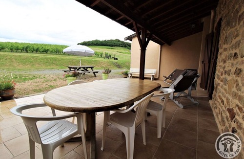 'Chez le Vigneron' is a gîte for 10 people with 3 bedrooms, at the heart of the Beaujolais 'Pierres Dorées' region, in the small medieval village of Ternand plenty of character, near Oingt, listed as one of the most beautiful villages in France, and also near hiking paths. Ideal for 1 night, a weekend or longer stay. Warm welcome offered by the owners Jean-Jacques & Marie-Jo, who can arrange a tasting (real oenology course) and make you learn about the profession of winegrower. Detached stone-built gîte adjoining owners' home. Single level, disabled access. Guests will enjoy peace and the lovely views of the vineyards from the 2 covered terraces. Ground floor : entrance hall, large living room (kitchen, dining areas), small separate lounge area with TV. 3 bedrooms (1 double room & 2 bedrooms for 4 people), 2 shower rooms (one has disabled access and includes toilets), separate Wc. Bed linen supplied (beds are made before arrival), final cleaning included in rent. Baby equipment on request. Outdoors : sets of garden furniture, deck chairs, barbecue, extensive grounds, lovely views of the countryside and vineyards, parking. On-site, wine cellar with organised activities : wine museum, wine courses (1 course is offered during your stay). Facilities for camper vans. Ideal for getting together with friends or family to explore the Beaujolais, its gastronomy, wine and the 'Pierres Dorées' heritage.