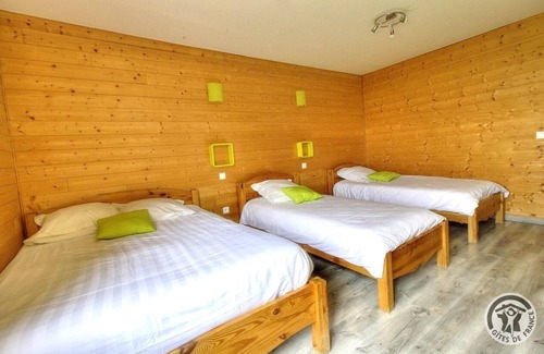 At heart of the wine-growing Beaujolais, stop-over/group gîte on wine estate just 1.5 km from the center of Fleurie. Located in the same building as owners' house, lovely open views of the vineyards. Ground-floor : large living room (it can accommodate up to 38 people, wine cellar style) with lounge area, wood-burning stove, TV. Fully fitted kitchen (semi-professional standard). Upstairs : lobby (coat hooks, shoe cupboard), 3 chalet style bedrooms (4 single beds) (4 single beds) (double bed, 2 single beds), each with en-suite facilities (shower, washbasin, separate WC). Cot on request. Cleaning at the end of stay included in rent. Outdoors: wooden deck with outdoor furniture (on same level as bedrooms). Toilet block (WC, washbasin, washing machine). Courtyard, wooden garden furniture, parking area, boules alley, large shared garden (1000 sq.m), private heliport on property (46° 12' 02'' - E 04° 41' 23''). Guests may be welcomed with a guided tour of farm (Terra Vitis sustainable viticulture) and tasting if interested. On site, 2 other gîtes for 10 & 6 people, ideal for family/friends gatherings (the 3 gîtes can be rented jointly for a gathering of 28 people in total). Food delivery by a nearby caterer can be arranged. Owners can also rent a B&B accommodation for 2 people, in wooden tiny house among the vineyards. Horseriders welcome (fields & paddocks available).