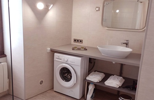 A living room and a desk are featured at this 2-bedroom, 1-bathroom rental. Bathroom amenities include a hair dryer, towels, and toilet paper. The kitchen is equipped with an oven, a stovetop, and a refrigerator, as well as a coffee maker, an electric kettle, and a microwave. And because there's a washing machine, you can go a bit lighter on your packing.