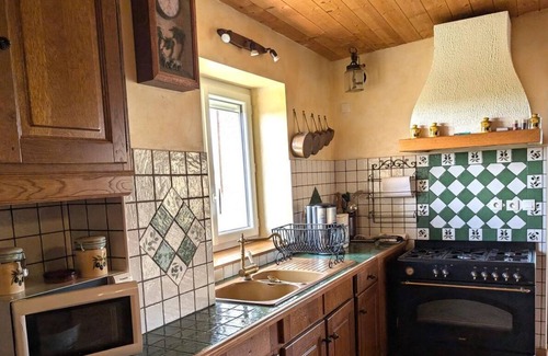 In peaceful countryside setting, cosy traditional gîte in renovated farmhouse, also including owners' home at the back of the house. Separate entrance, country-style décor (exposed beams, nice furnishings...), very comfortable. Upstairs : large terrace (18 sq.m) leading into large living room (exposed beams, nice furnishings), lounge/ dining areas, fitted kitchen. Laundry room. 2 Wcs. 3 bedrooms: (double bed, cot, ensuite shower room), (double bed + 2 single bunks), (double bed + single bed). Many storage areas. Bathroom (bath, shower, dual washbasin). Loan of mobile phone on request. Private garden, sunbeds, shared play area (table tennis, trampoline, boules set). Charge for pet: 10€/day. On request, tour of owners' goat farm (7 km away, produce sale available).