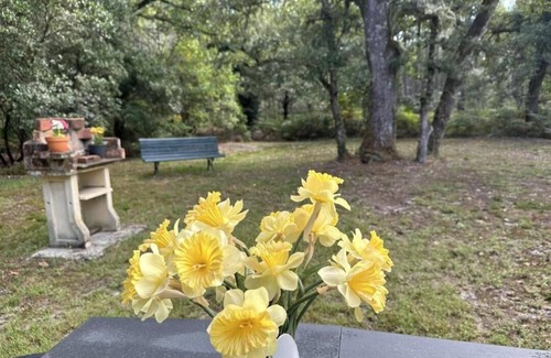 In the shade of old oak trees, Tambourin, a quiet and cozy gîte, is a real 'love nest', located very close to the 'Petite Leyre' river, natura 2000 area. On the spot, on the menu of your stay, according to the seasons, trout fishing, mushroom picking, observation of the flight of wood pigeons and common cranes, listening to the roar of the deer, meeting a deer, the discovery of wild orchids, royal osmondes... Depending on your areas of interest, we will be able to guide you, show you the "good addresses", the beautiful discoveries, so that your stay in Argelouse is unforgettable. This independent gîte on the ground floor is made up of a living room, kitchen area, lounge area with sofa bed, shower room, 1 bedroom (1 double bed, 1 single bed accessible/milling ladder from 8 years old) , Equipment: electric heating (heating extra according to consumption), microwave. Washing machine. Garden furniture, barbecue, terrace. Bike and equipment storage area. Shared land with owner on 35 ha, parking on property.