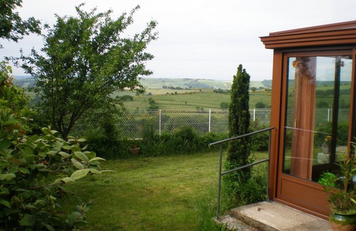 Rent individual house, in the heart of Aubrac, calm and shaded, with closed courtyard, garage and large veranda, with view on the Lot valley.